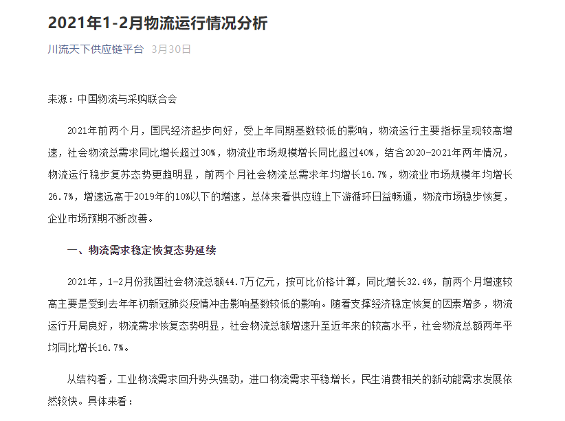 2021年1-2月物流运行情况分析