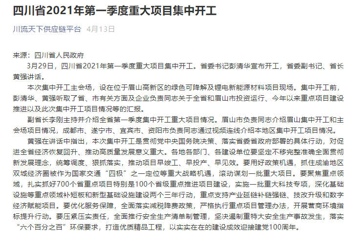 四川省2021年第一季度重大项目集中开工