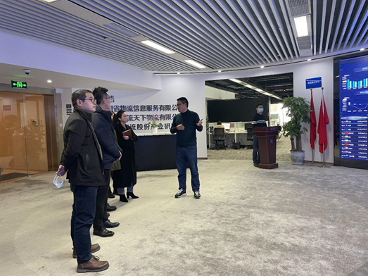 首先,川流天下董事长潘蔡巍对肖挚总经理一行的到来表示了热烈欢迎,潘总通过公司大屏显示系统,向嘉宾详细讲解了川流天下供应链平台的业务范围及模式,对实际物流业务中的信息流、数据流、物流、车后市场数据等全流程信息进行了介绍。